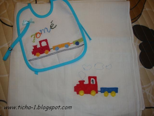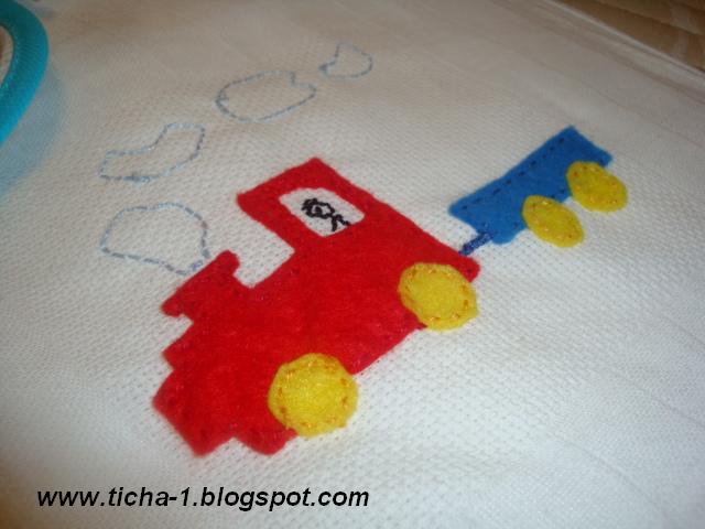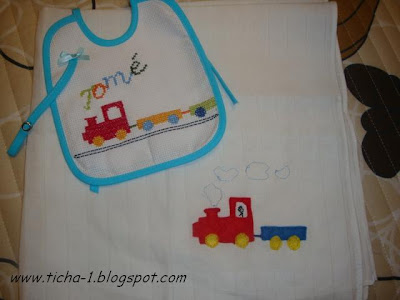 Fiz uma babete e fralda com comboio....